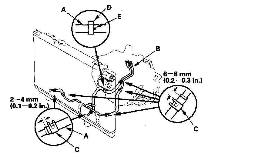 Clamp the ATF cooler hose with the yellow mark (D) on the clamp (E).