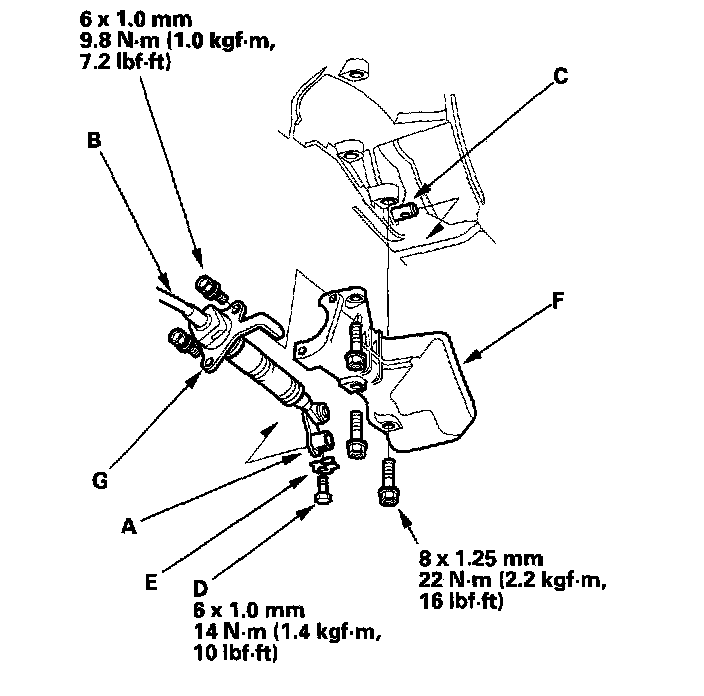 14. Install the shift cable cover (F), then install the shift cable holder (G) on the shift cable cover.