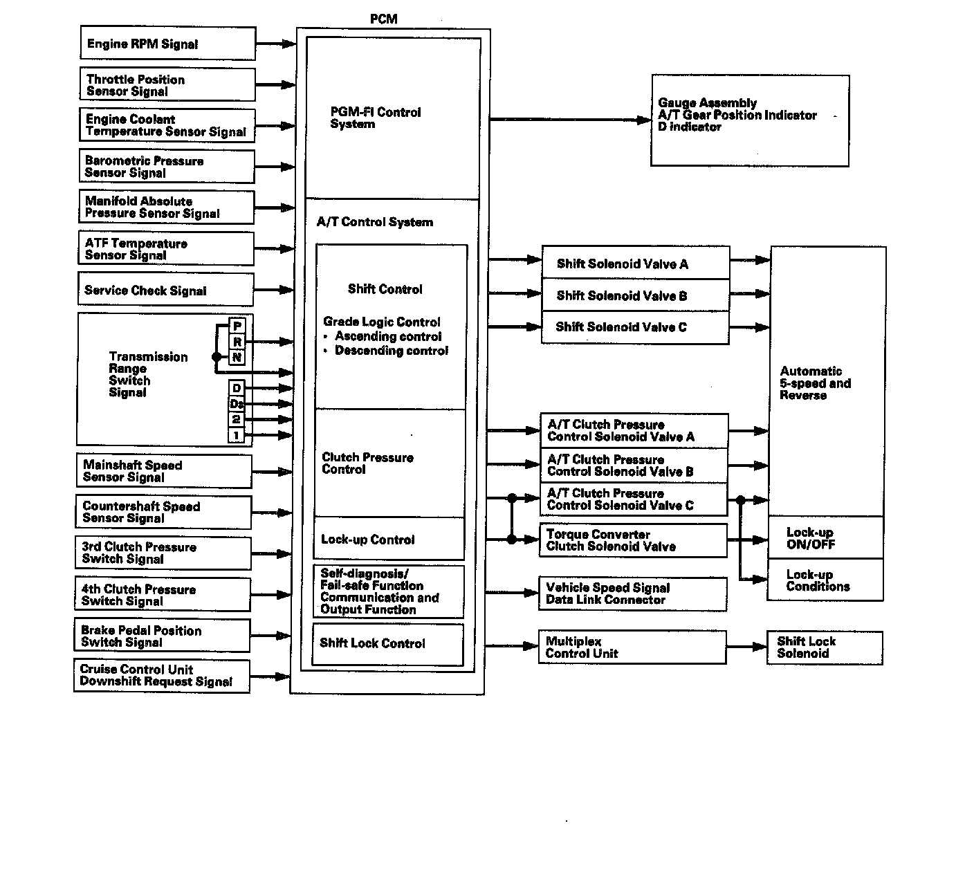 The PCM receives input signals from the sensors, switches, and other control units, perform processing data, and outputs signals for the engine control system and A/T control system. The A/T control system includes shift control, grade logic control, clutch pressure control, and lock-up control is stored in the PCM. The PCM switches the shift solenoid valves and the A/T clutch pressure control solenoid valves to control shifting transmission gears and lock-up torque converter clutch.