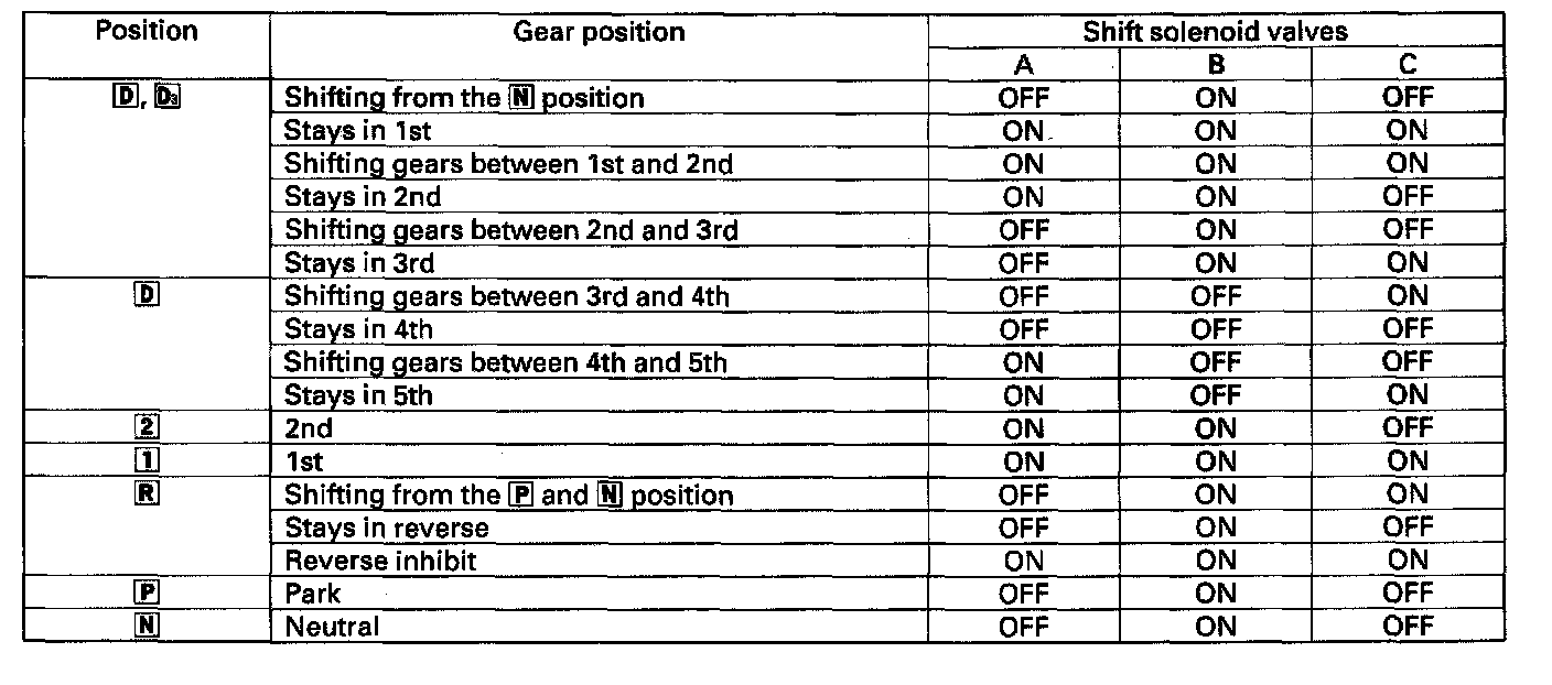 The combination of driving signals to shift solenoid valves A, B, and C are shown in the table.