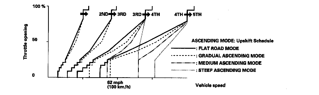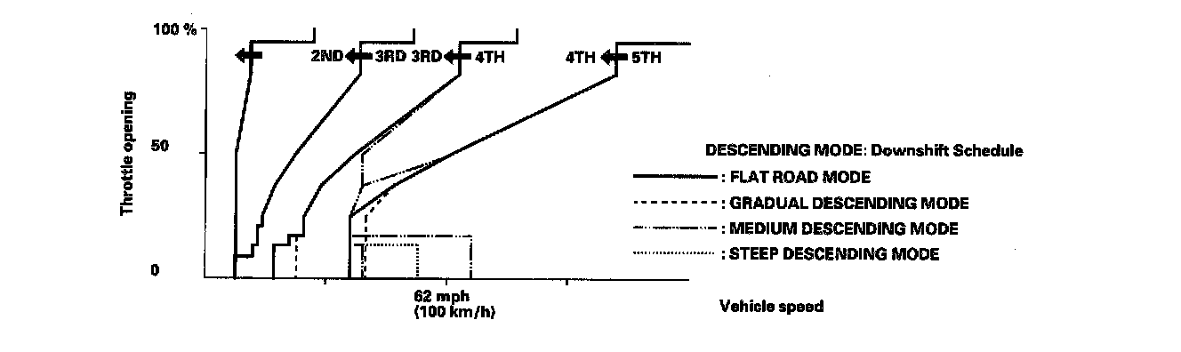 When the PCM determines that the vehicle is going down a hill in the D, and D3 positions, the shift-up speed from 4th to 5th gear, 3rd to 4th gear and from 2nd to 3rd (when the throttle is closed) becomes faster than the set speed for flat road driving to widen the 4th gear, 3rd gear and 2nd gear driving areas. This, in combination with engine braking from the deceleration lock-up, achieves smooth driving when the vehicle is descending. There are three descending modes with different 4th gear driving areas, 3rd gear driving areas and 2nd gear driving areas according to the magnitude of a gradient stored in the PCM. When the vehicle is in 5th gear or 4th gear, and you are decelerating while applying the brakes on a steep hill, the transmission will downshift to lower gear. When you accelerate, the transmission will then return to higher gear.