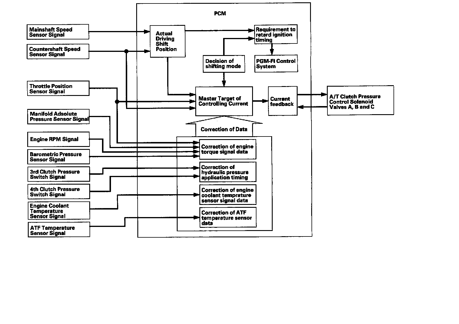 The PCM receives input signals from the various sensors and switches, performs processing data, and outputs a current to the A/T clutch pressure control solenoid valves A, B, and C.