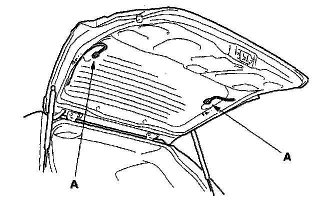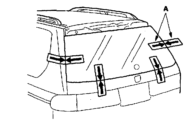 12. Set the rear window in the opening, and center it. Make alignment marks (A) across the rear window, tailgate and body with a grease pencil at the four points shown. Be careful not to touch the rear window where adhesive will be applied.