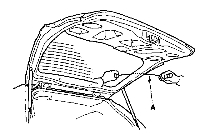 5. With a helper on the outside, pull the piano wire (A) back and forth in a sawing motion. Hold the piano wire as close to the rear window as possible to prevent damage to the tailgate, and carefully cut through the adhesive around the entire rear window.