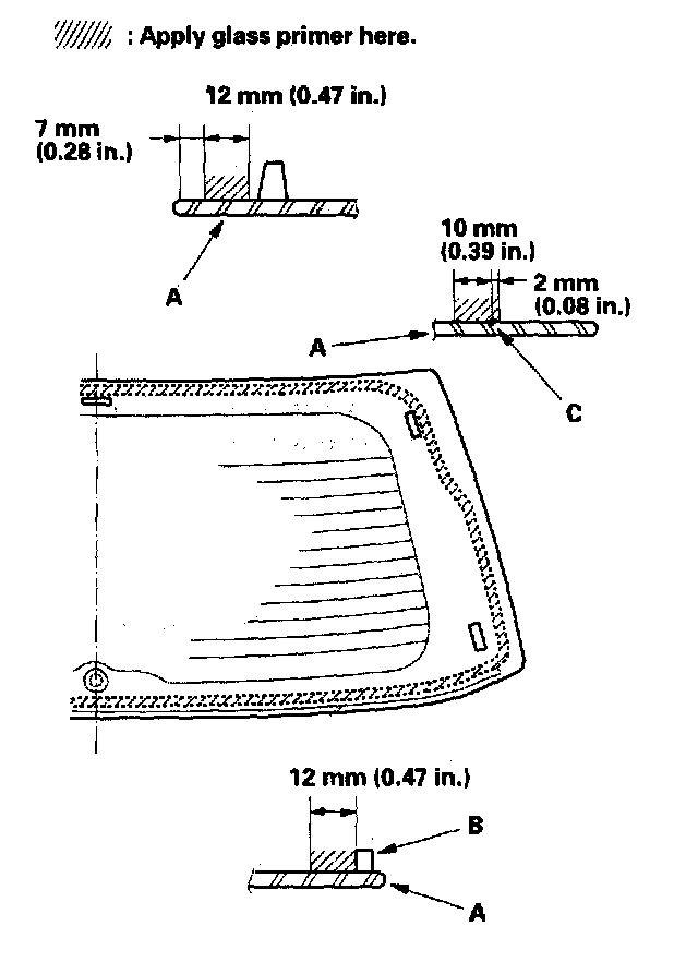 - Never touch the primed surfaces with your hands. If you do, the adhesive may not bond to the rear window properly, causing a leak after the rear window is installed.