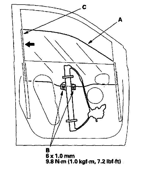 4. Push the glass (A) against the center channel (C), then tighten the glass mounting bolts.