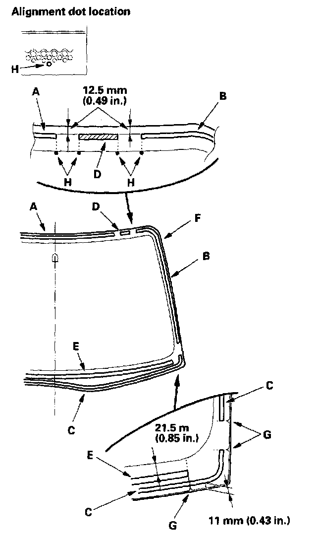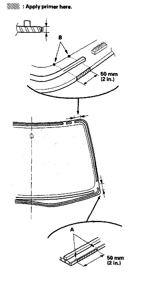 12. Apply primer (3M N-200, or equivalent) to the areas between the alignment marks (A) and alignment dots (B) to the edge of the windshield. Be careful not to touch the windshield where adhesive will be applied.