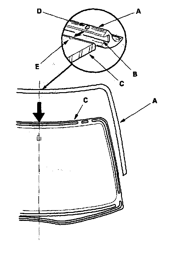18. With a sponge, apply a light coat of glass primer around the edge of the windshield (A) between the upper rubber dam (B), side rubber dam (C), lower rubber dam (D) and molding (E) as shown, then lightly wipe it off with gauze or cheesecloth: