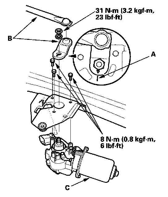 5. Scribe a line (A) across the link and windshield wiper linkage to show the original adjustment. Separate the windshield wiper linkage (B) from the wiper motor (C).