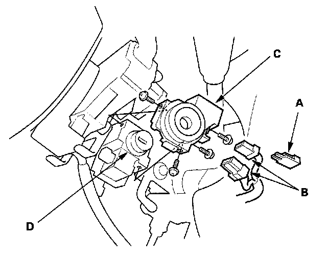 7. Remove the screws and the immobilizer control unit-receiver from the ignition key cylinder (D).