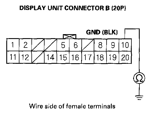 5. Check for continuity between display unit connector B (20P) terminal No. 10 and body ground.