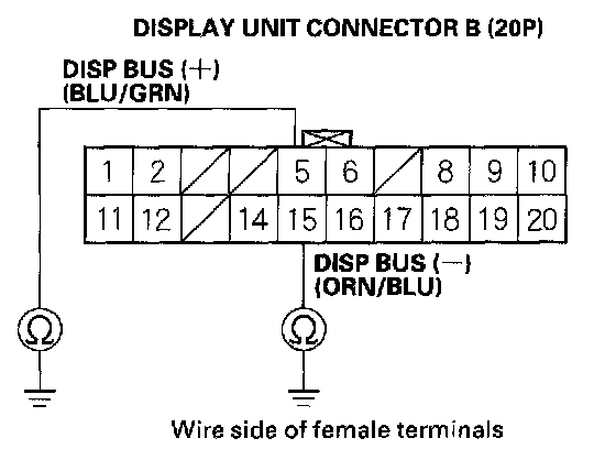 7. Check for continuity between body ground and display unit connector B (20P) terminal No. 5 and No. 15 individually.