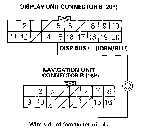 9. Check for continuity between display unit connector B (20P) terminal No. 15 and navigation unit 16P connector B(16P) terminal No.15
