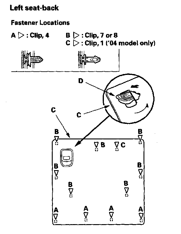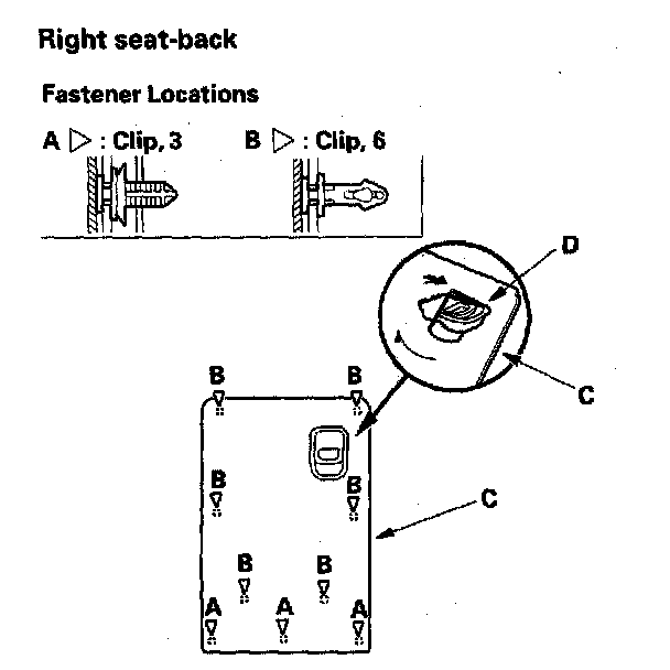 - Replace all of the clips fastening the seat-back cover (A) and pad wire (6) with new ones (C) using commercially available upholstery ring pliers (D).