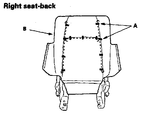 7. Pull back the edge of the seat-back cover (A) all the way around, then release all of the clips (B). Remove the seat-back cover (C).