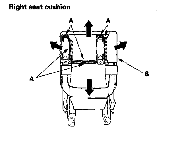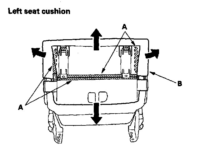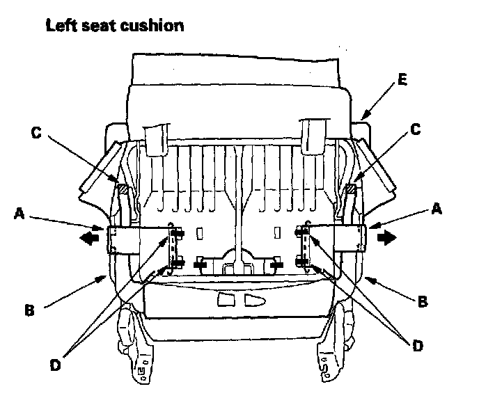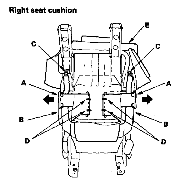 5. Detach the retainers (A) from both sides of the link (B), and release all of the hook strips (C) and clips (D) from under the seat cushion (IE).