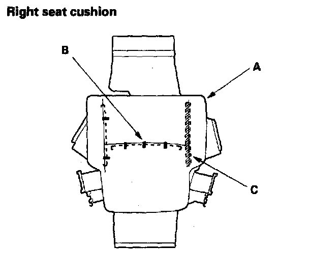 6. Pull back the edge of the seat cushion cover (A) all the way around, release all of the clips (B), and release the fastener (C) under the right seat cushion cover, then remove the seat cushion cover.
