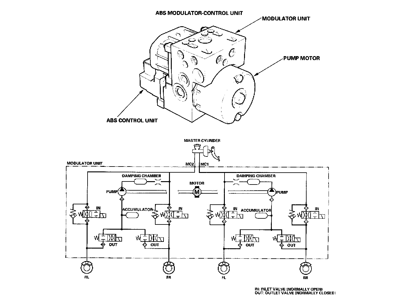 The ABS modulator consists of the inlet solenoid valves, outlet solenoid valves, reservoir, pump, pump motor, and the damping chamber. The modulator reduces the caliper fluid pressure directly. It is a circulating-type modulator because the brake fluid circulates through the caliper, reservoir, and the master cylinder. The hydraulic control has three modes: pressure intensifying, pressure retaining, and pressure reducing. The hydraulic circuit is an independent four-channel type, one channel for each wheel.