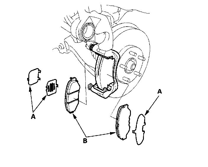 2. Check the thickness of the inner pad (A) and outer pad (B). Do not include the thickness of the backing plate.