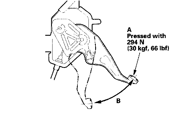 1. Press the parking brake pedal (A) with 294 N (30 kgf, 66 lbs.) of force. The parking brake pedal should travel within the specified number of clicks (B).