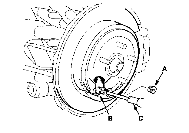 4. Turn up the ratchet teeth (B) or the adjuster assembly with a flat -tip screwdriver (C) until the shoes lock against the drum. Then back off ten clicks, and install the access plug.