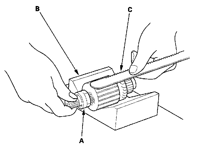 9. Place the armature (A) on an armature tester (B). Hold a hacksaw blade (C) on the armature core. If the blade is attracted to the core or vibrates while the core is turned, the armature is shorted. Replace the armature.
