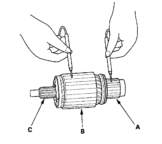 10. Check with an ohmmeter that no continuity exists between the commutator (A) and armature coil core (B), and between the commutator and armature shaft (C). If continuity exists, replace the armature.