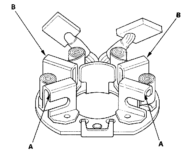 12. Check that there is no continuity between the (+) brush holder (A) and (-) brush holder (B). If there is continuity, replace the brush holder assembly.
