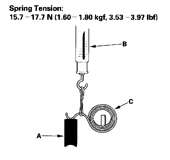 13. Insert the brush (A) into the brush holder, and bring the brush into contact with the commutator, then attach a spring scale (B) to the spring (C). Measure the spring tension at the moment the spring lifts off the brush. If the spring tension is not within specification, replace the spring.