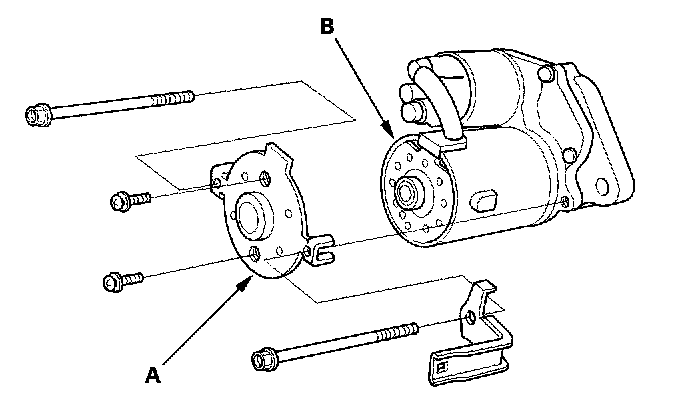 16. Install the starter end cover (A) to retain the brush holder (B).