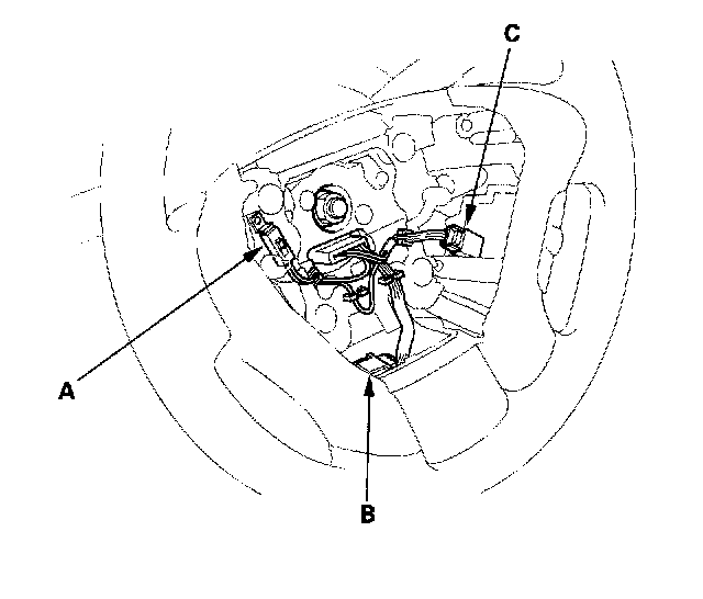 2. Disconnect the horn switch connector (A), radio remote switch connector (B) and cruise control switch connector (C).