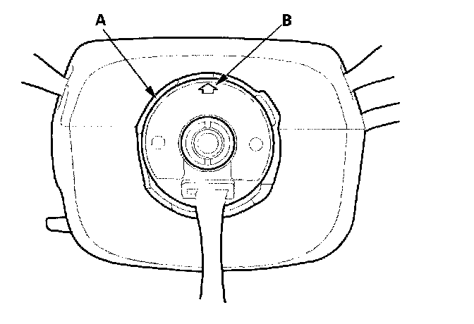1. Before installing the steering wheel, make sure the front wheels are aligned straight ahead, then center the cable reel (A). Do this by first rotating the cable reel clockwise until it stops. Then rotate it counterclockwise about two and a half turns. The arrow mark (B) on the cable reel label point should point straight up.