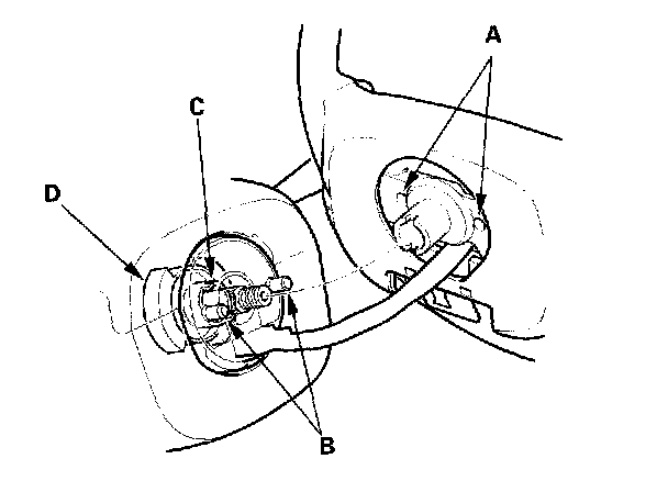 2. Install the steering wheel on to the steering column shaft, making sure the steering wheel hub (A) engages the pins (B) of the cable reel and tabs (C) of the canceling sleeve (D). Do not tap on the steering wheel or steering column shaft when installing the steering wheel.