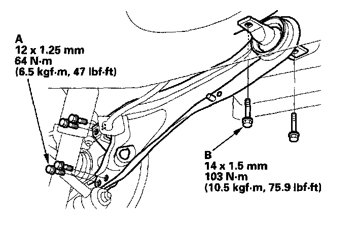 6. Remove the flange bolts (A) and trailing arm mounting bolts (B) from the trailing arm, then remove the trailing arm.