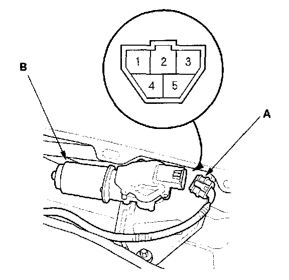 2. Disconnect the wiper motor connector (A) from the wiper motor (B).