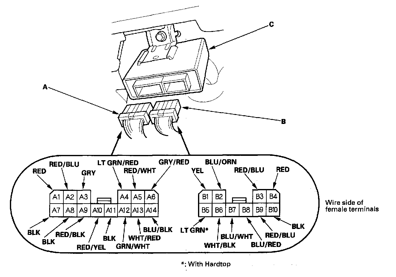 2. Disconnect the 14P connector (A) and 10P connector (B) from the convertible top control unit (C).