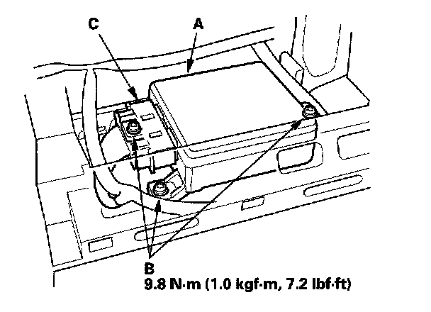 1. Install the new SRS unit (A) with Torx bolts (B), then connect the SRS unit 18P connector (C) to the SRS unit; push it into position until it clicks.