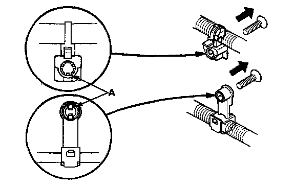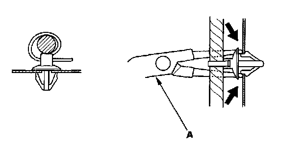 - Slip pliers (A) under the clip base and through the hole at an angle, then squeeze the expansion tabs to release the clip.