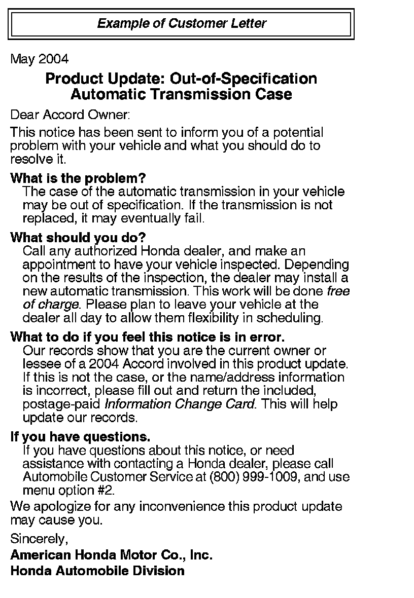 American Honda is announcing a product update campaign to replace the automatic transmission in certain Japan-built Accords. On affected vehicles, the transmission case is out of specification. This could eventually cause the transmission to fail.