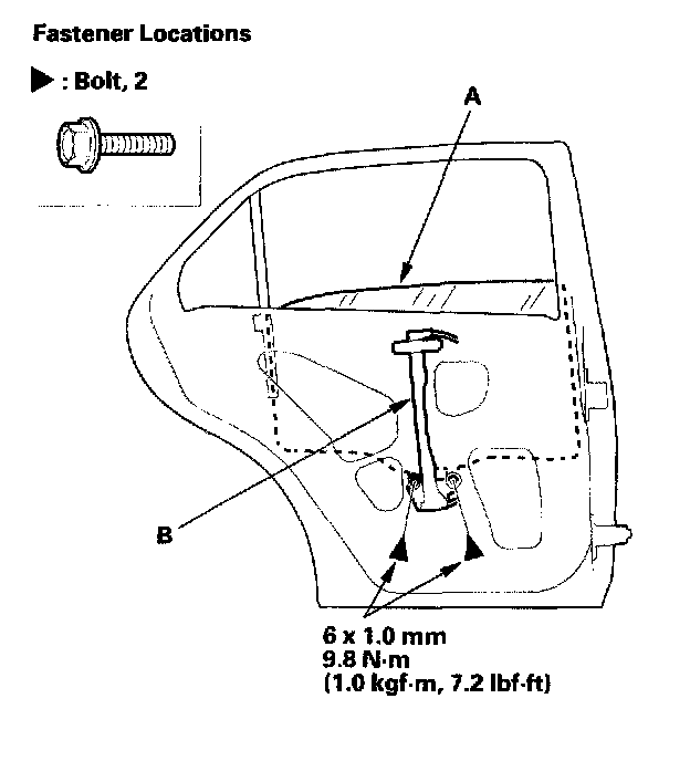 2. Carefully move the glass (A) until you can see the bolts, then remove them. Remove the glass from the regulator (B), and carefully lower the glass. Take care not to drop the glass inside the door.