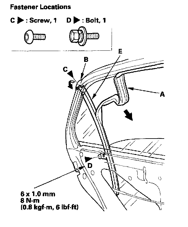 3. Pull the glass run channel (A) away as needed. Pull the door weatherstrip (B) away as needed, then remove the screw (C). Remove the bolt (D) securing the center channel (E).