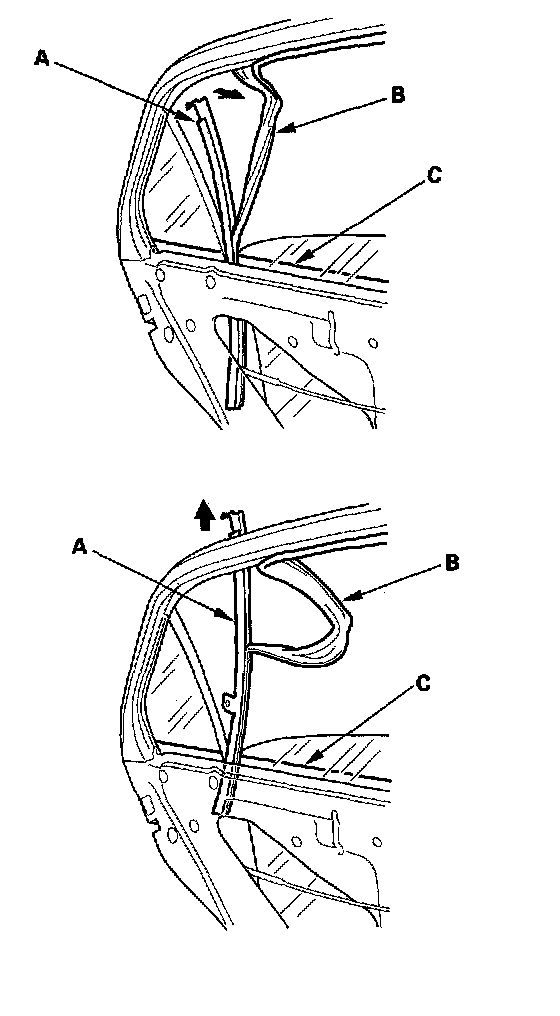 4. Pull the upper portion of the center channel (A) forward to remove it from the door quarter glass seal (B), then pull up and remove the center channel out through the window slot. Take care not to damage the outer weatherstrip (C).