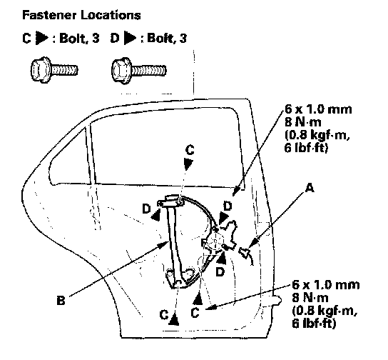 8. Remove the bolts (C), and loosen the bolts (D), then remove the regulator through the hole in the door.
