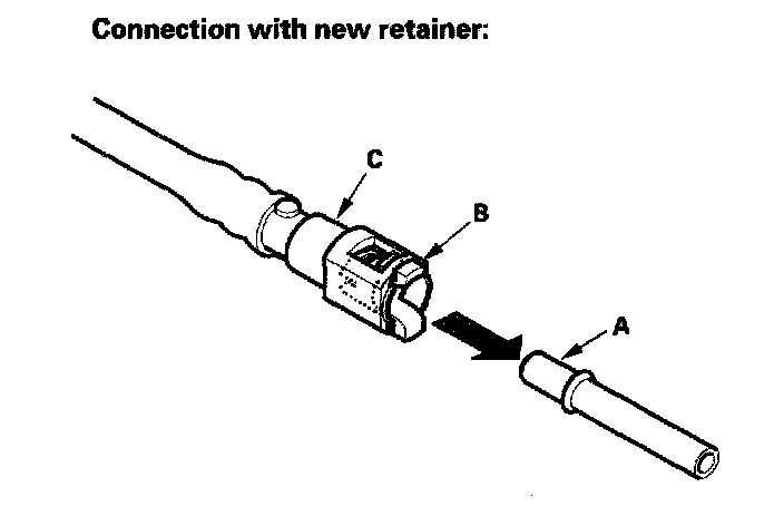 4. Align the quick-connect fittings with the line (A), and align the retainer (B) locking pawls with the connector (C) grooves. Then press the quick- connect fittings onto the line until both retainer pawls lock with a clicking sound.