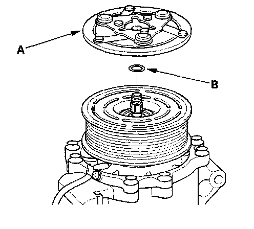 1. Remove the center nut (A) while holding the armature plate with a commercially available A/C clutch holder (B).