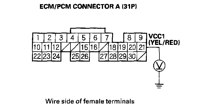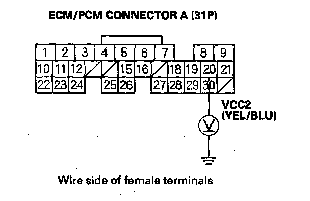 61. Measure voltage between body ground and ECM/PCM connector terminal A20.