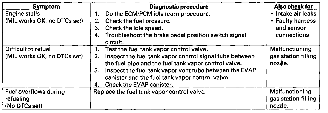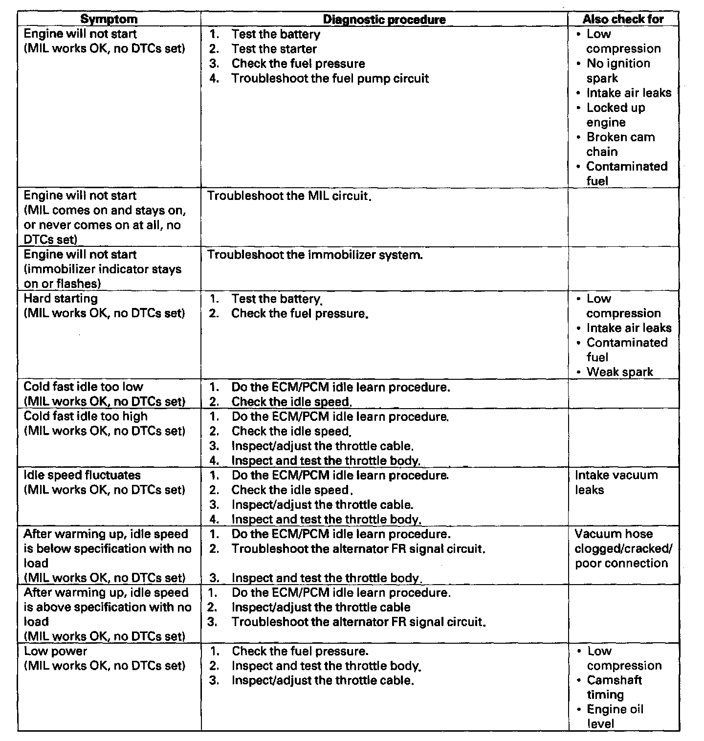 When the vehicle has one of these symptoms, check for a diagnostic trouble code (DTC) with the scan tool. If there is no DTC, do the diagnostic procedure for the symptom, in the sequence listed, until you find the cause.