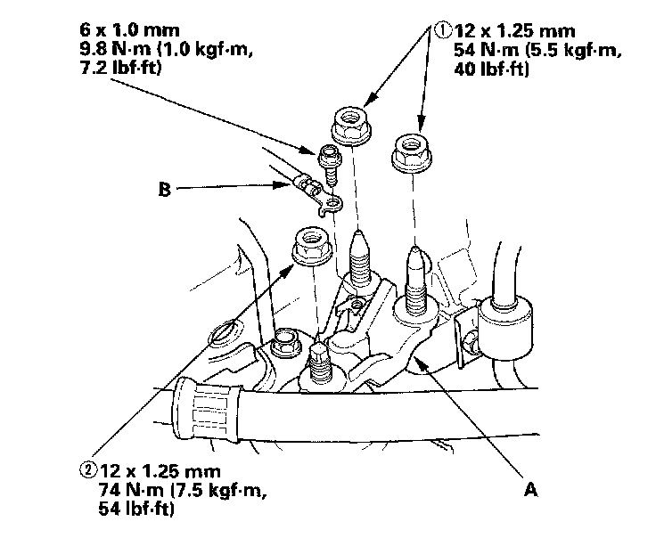 5. Align the reference marks (A) that you made on the subframe with the center (B) of the bolt heads, then tighten the bolts to the specified torque.
