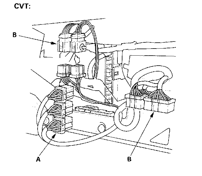 13. Remove the harness clamps (A) and grommet (B), then pull the engine wire harness through the bulkhead.