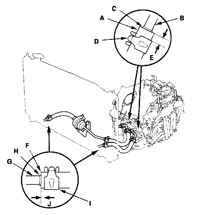 2. Slide the ATF cooler hoses (F) over the ATF cooler lines (G) to bulge (H) on the lines, then secure the hoses with the clips (I) at 2 - 4 mm (0.1 - 0.2 inch) (J) from the hose ends.